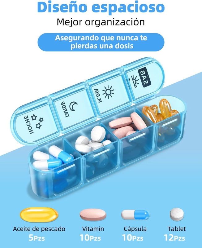 Con cuatro compartimentos para cada día, puedes gestionar tus dosis de la mañana, mediodía, tarde y noche con precisión. Nunca más dudarás de qué pastilla tomar ni cuándo.