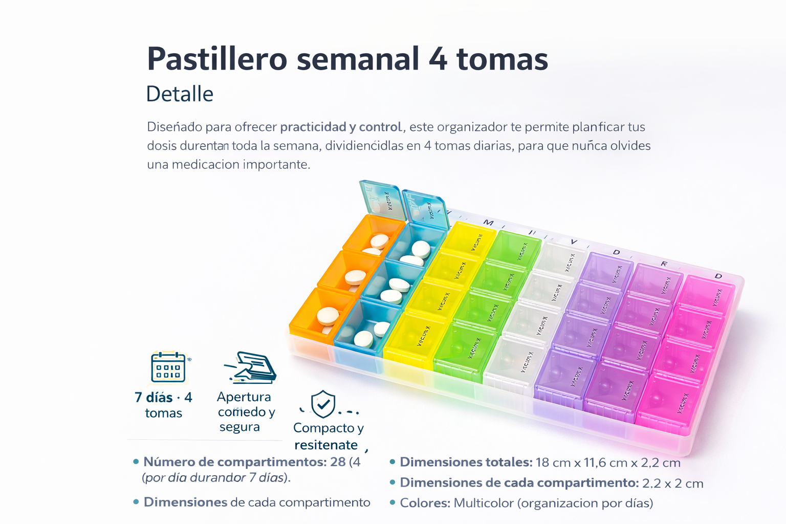 Pastillero semanal con 4 tomas diarias · Orden y tranquilidad cada día